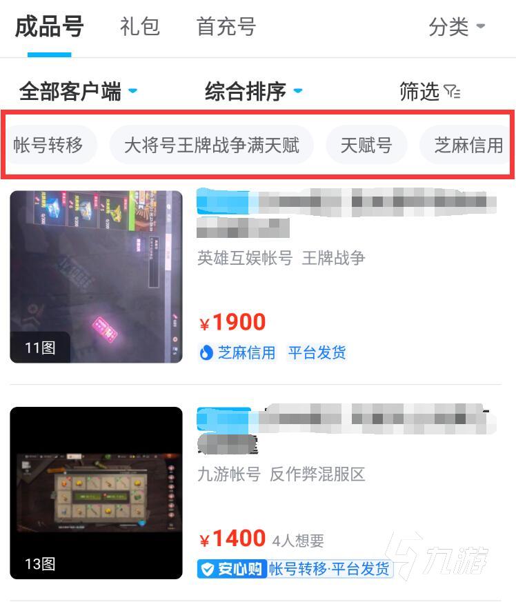 在平臺上,各種游戲都有不同的分類,尤其一些大型游戲,更是根據(jù)游戲中的某款皮膚、飾品等進(jìn)行了進(jìn)一步分類,當(dāng)然最常見的還是區(qū)服,畢竟這是跟手機(jī)有關(guān)系的硬性要求。就拿王牌戰(zhàn)爭這款游戲來說,小編發(fā)現(xiàn),平臺上可以看到多種賬號類型,比如賬號轉(zhuǎn)移、滿天賦號、大將號等等,這樣也是方便了買家快速查找,能夠節(jié)省不少時(shí)間。