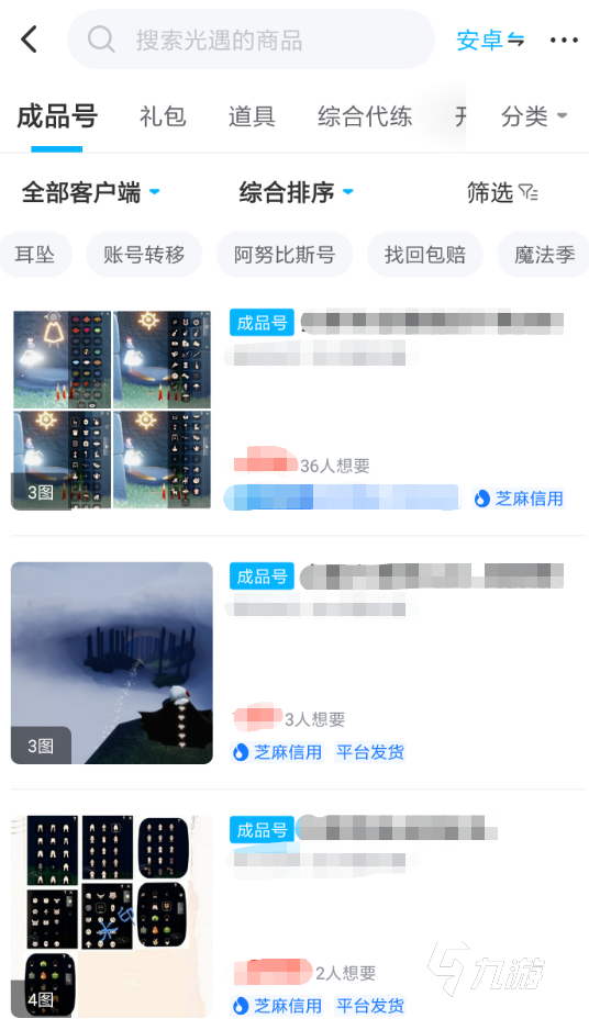 2、交易貓的優(yōu)勢很多,其中最大的特色就是擁有海量的游戲賬號類型。對于想要追求霞谷畢業(yè)號的玩家來說,只需要在光遇專區(qū)當中去搜索即可。為了節(jié)約各位的實際,小編建議大家在瀏覽商品的時候,合理使用標簽、篩選、分類這三個功能。