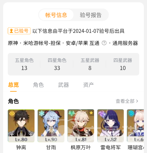 這款軟件對(duì)于賬號(hào)的信息展示還是比較詳細(xì)的,除了賣家上傳的一些截圖之外,有一些賬號(hào)還經(jīng)過(guò)了官方的平臺(tái)驗(yàn)號(hào),會(huì)自動(dòng)為我們整理出賬號(hào)中五星角色、四星角色以及對(duì)應(yīng)武器的數(shù)量,更是能夠直接檢索各個(gè)角色的等級(jí)、品質(zhì)、武器等,而且還可以直接看到賬號(hào)中帶有的原石、糾纏之緣數(shù)量,從而對(duì)包含的資產(chǎn)有一個(gè)詳細(xì)了解。除此之外,交易貓還帶有一些安全保障機(jī)制,建議在挑選商品的時(shí)候選擇一些帶有贈(zèng)送永久包賠、賣家經(jīng)過(guò)實(shí)名實(shí)人認(rèn)證的賬號(hào),這樣就能夠在買(mǎi)號(hào)的過(guò)程中更加安全可靠!