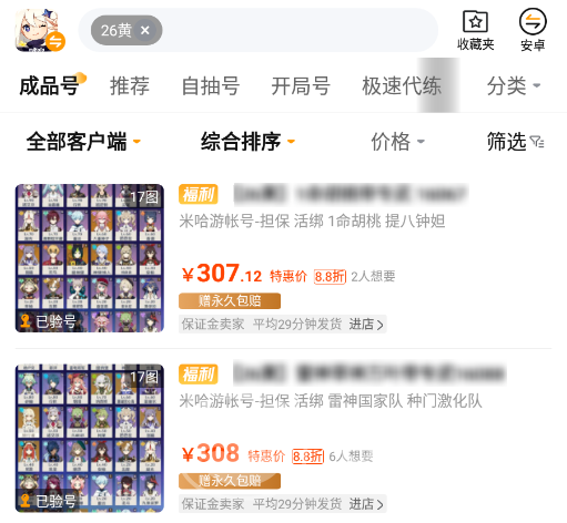 交易貓這款平臺(tái)中帶有的原神賬號(hào)還是非常多的,如果在挑選賬號(hào)的時(shí)候大家有自己的需求,也可以直接在專區(qū)中通過(guò)搜索來(lái)快速篩選及檢索,比如說(shuō)想要購(gòu)買(mǎi)帶有26黃的賬號(hào),直接搜索26黃就可以了,這里就會(huì)將滿足條件的一些賬號(hào)優(yōu)先展示出來(lái),對(duì)比一下價(jià)格也可以非常輕松地完成估值。
