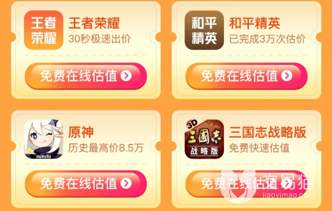當(dāng)然,游戲賬號交易的時候,不管是一些主流大眾都在玩兒的游戲,或者是一些小眾類的游戲,在交易的時候都需要對游戲賬號進(jìn)行估價。看來不同的游戲有不同的估價方式,讓用戶自己估價的話,不僅無法做到準(zhǔn)確的價格預(yù)估,而且還特別的麻煩。為此在交易貓上給大家貼心的提供了游戲賬號估價服務(wù),其中支持游戲賬號估價的游戲有王者榮耀,和平精英、元神以及三國殺戰(zhàn)略版。如果玩家想要交易這幾款游戲的話,可以在這里享受賬號估價服務(wù)。