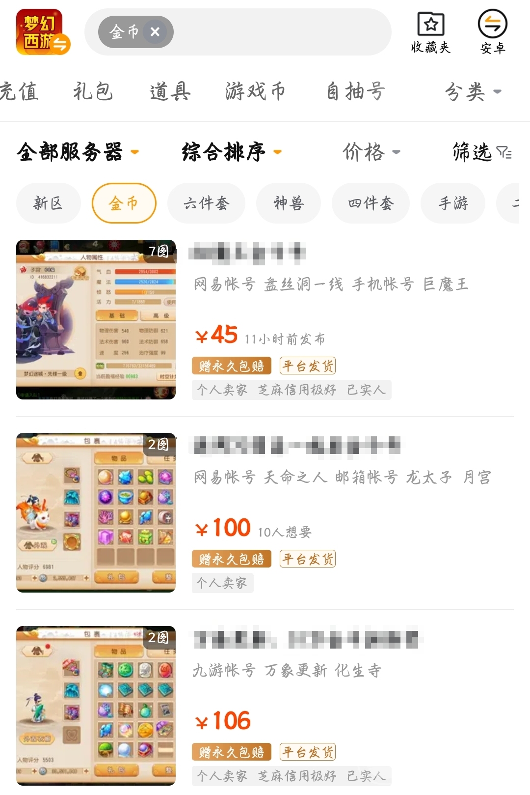 找金幣號也很簡單,大家登錄該平臺之后,搜索夢幻西游這個游戲的名稱,然后找到相應(yīng)的交易專區(qū),在交易專區(qū)里可以根據(jù)自己想要購買的賬號類型進行篩選,選擇金幣區(qū)間之后,大家能夠看到的都是金幣資源非常豐富的賬號,價格不等有幾十上百,小伙伴們根據(jù)具體的資源情況和手里的資金情況去選擇就可以了。