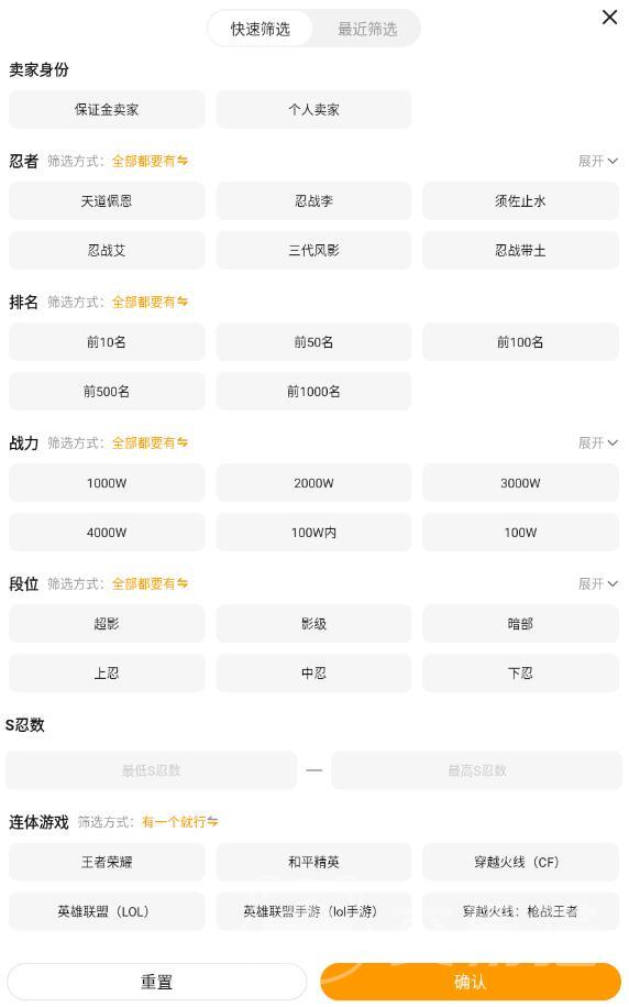方便的賬號(hào)篩選服務(wù),能幫你快速定位想要的賬號(hào),在搜索想要的商品時(shí),大家可以打開篩選列表,按照戰(zhàn)力、段位以及忍者數(shù)量去搜索,系統(tǒng)會(huì)為你提供一批符合要求的商品,接著再從中選取你要的。