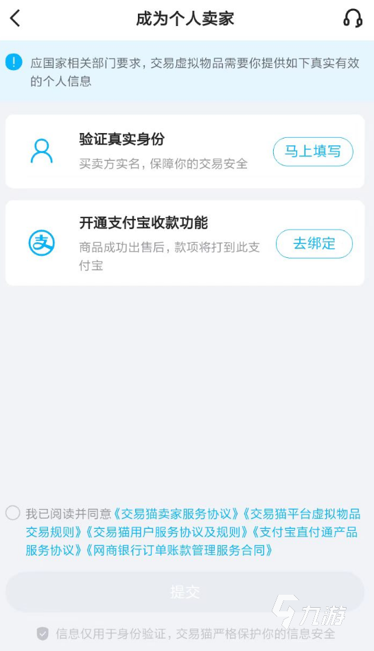 1、普通用戶如果是剛使用交易貓,最好是在平臺內(nèi)申請成為一個個人賣家。該賣家身份會為大家?guī)碛螒蛸~號商品的發(fā)布權(quán)限,這樣玩家們的商品才會讓其他人看到。同時,申請流產(chǎn)的便利性也不會浪費大家太多的實際。