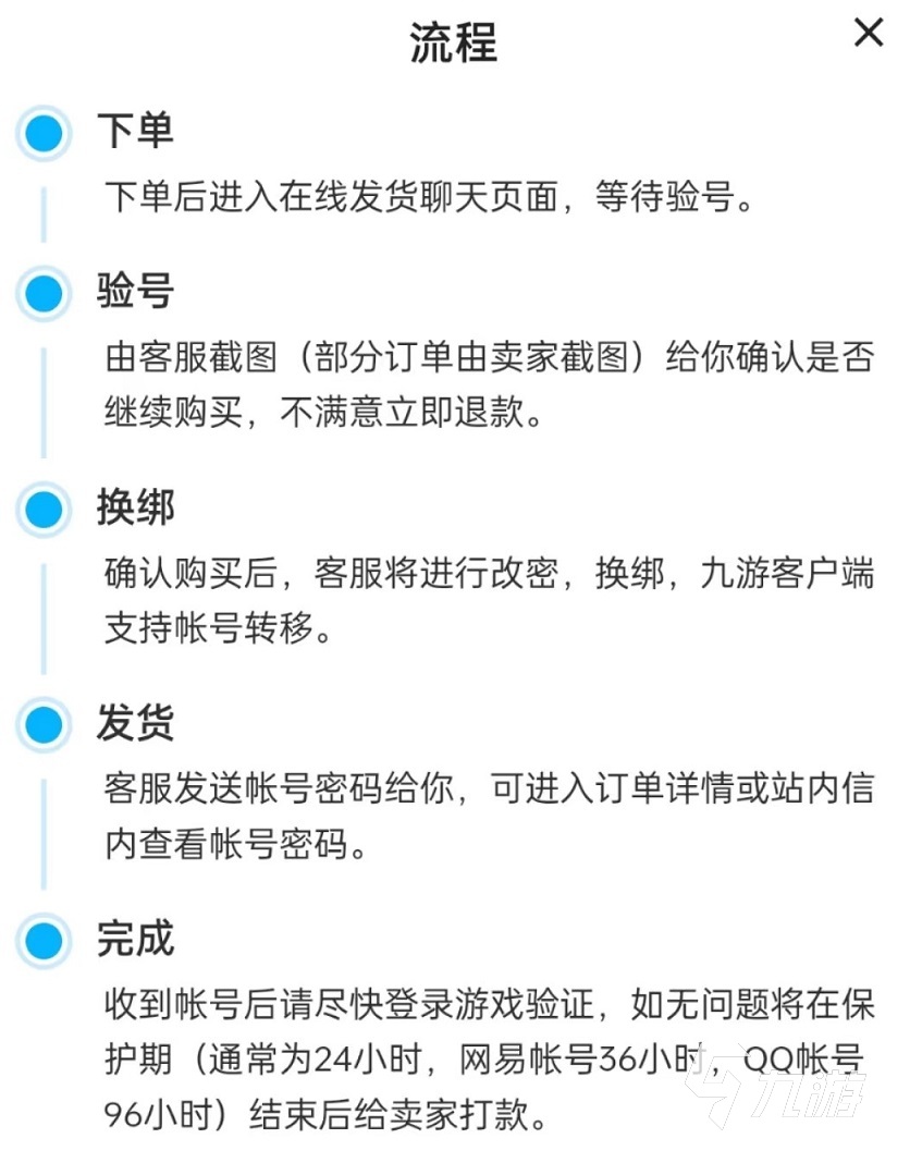 確定一個賬號要進行交易時,交易貓也會彈出具體的下單流程。所有的賬號均是官方驗證,用戶進行確認(rèn),滿意即可進行接下來的換綁程序中。買家收到賬號之后需要立即上線驗號,滿意即可確認(rèn),平臺將會把錢款打入賣家賬戶。至此,一個完整的安全的交易流程就完成了。在這其中任何一步,不滿意即可結(jié)束交易。