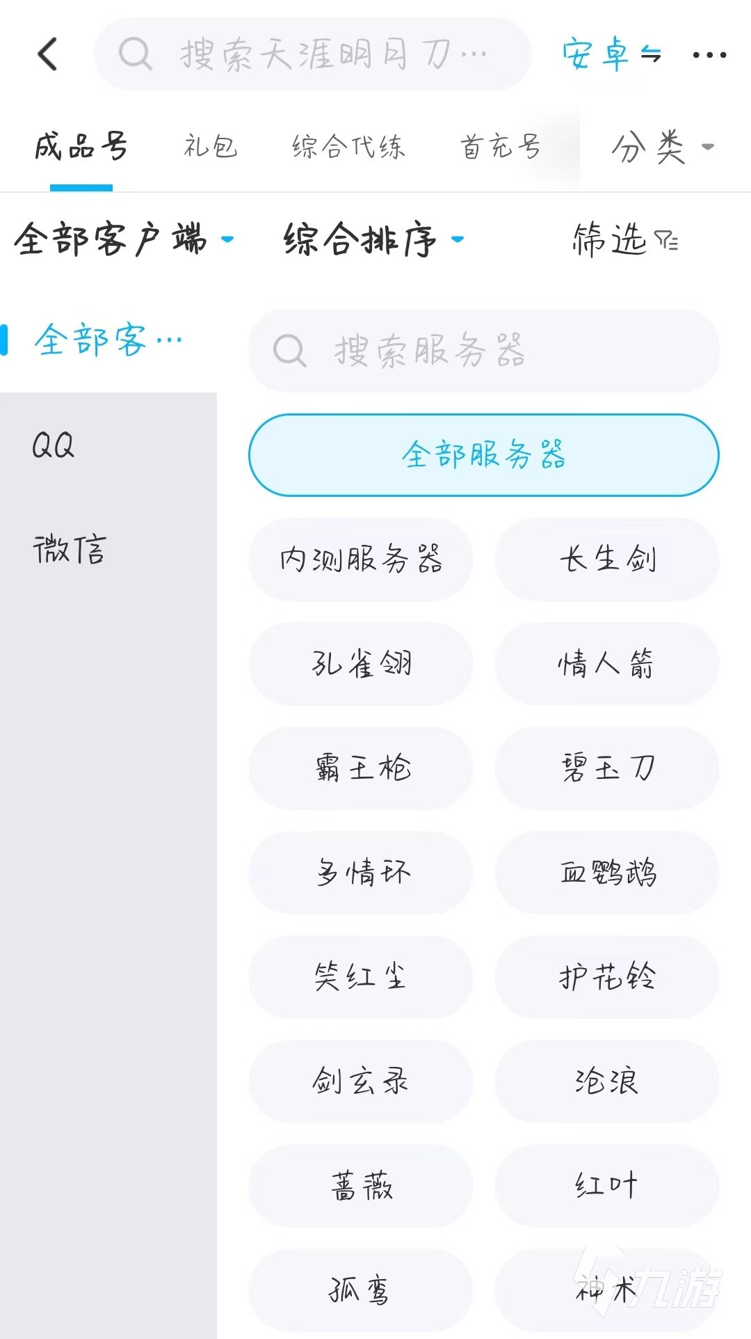 大家只需要在搜索欄輸入天刀,就可以看到對應(yīng)的游戲?qū)^(qū)。點擊進入,就能看到大量的用戶發(fā)布的出售賬號的帖子。這個時候大家可以進行一個系統(tǒng)的初步篩選??梢赃x擇是安卓賬號還是蘋果賬號,可以選擇是微信端還是QQ端,還可以選擇區(qū)服信息,非常詳細。