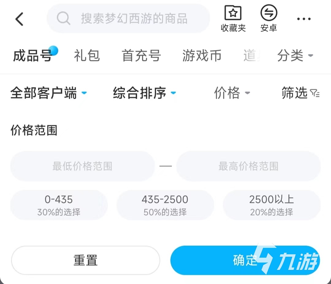 交易貓平臺內為絕大多數(shù)游戲都設立了交易專區(qū),用于展示與這款游戲相關的在售賬號或物品,夢幻西游這種熱度一直不低的游戲自然也在其列。專區(qū)內有多個細分化的選項,用于對專區(qū)內的訂單進行精準定位和查找。這時的“價格”選項就能看到前文提到的“價格走勢”問題,如下圖所示,現(xiàn)階段50%的玩家鐘愛435-2500這個價位的賬號,其他價位區(qū)間加起來一共占了另外50%。