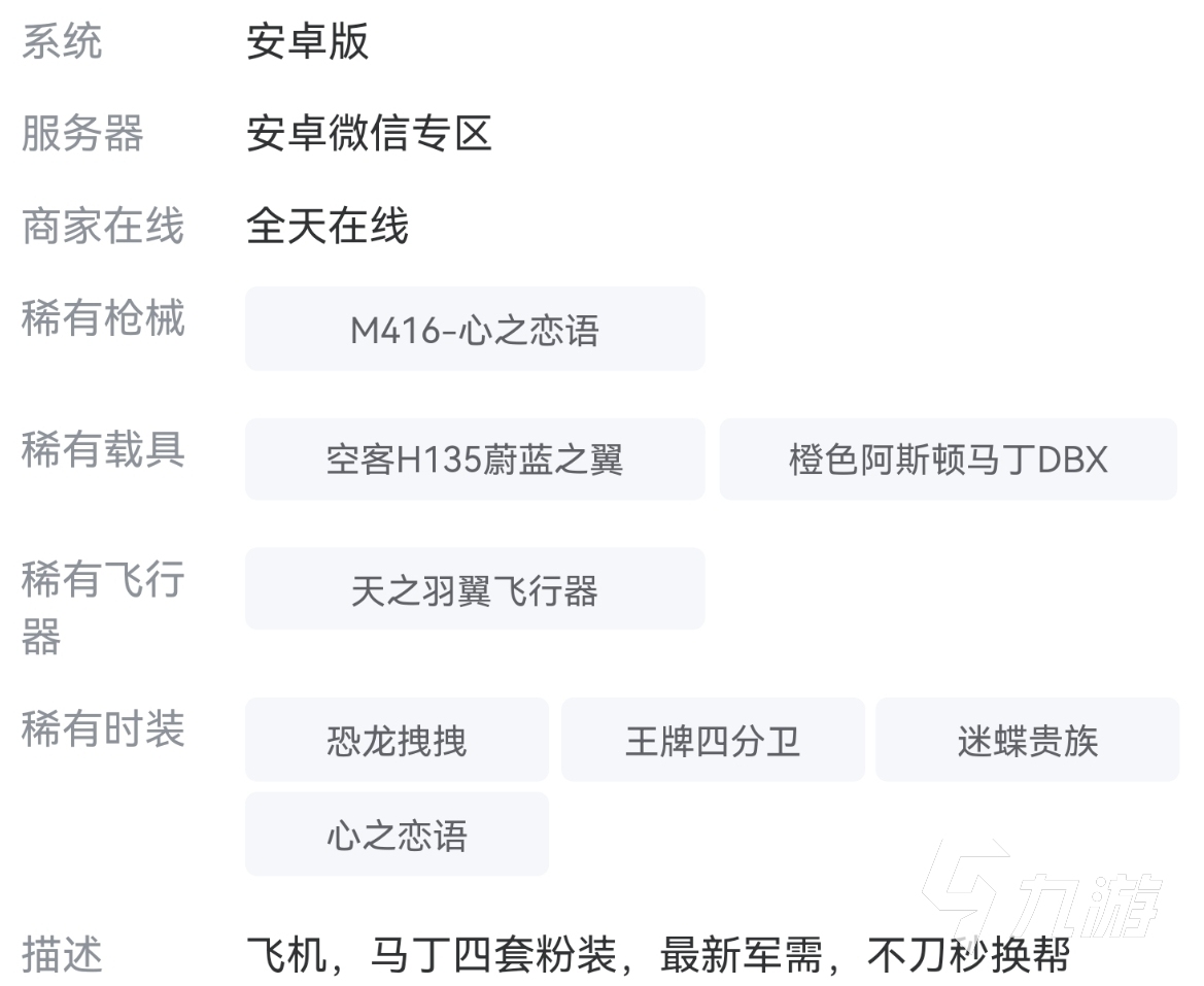 2.完整全面的信息展現(xiàn),賬號內(nèi)容公開透明。在這個平臺內(nèi),進行銷售的所有賬號,賣家都會將自己號內(nèi)的物品,一五一十地寫出來,供有需要的買家瀏覽,這樣做可以讓購買者,對自己的賬號提前有一個了解,避免買到不合適的賬號。