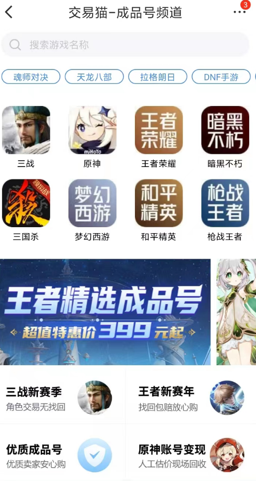 如果各位是第一次進入到交易貓當中,那么三國殺的玩家可以直接來到成品號頻道內(nèi),在這里就可以輕松獲取大量游戲賬號。同時,其他熱門游戲的專區(qū)入口也將任意玩家選擇,方便各位后期在玩其他游戲的過程中,依然可以快速找到最精準的交易內(nèi)容。