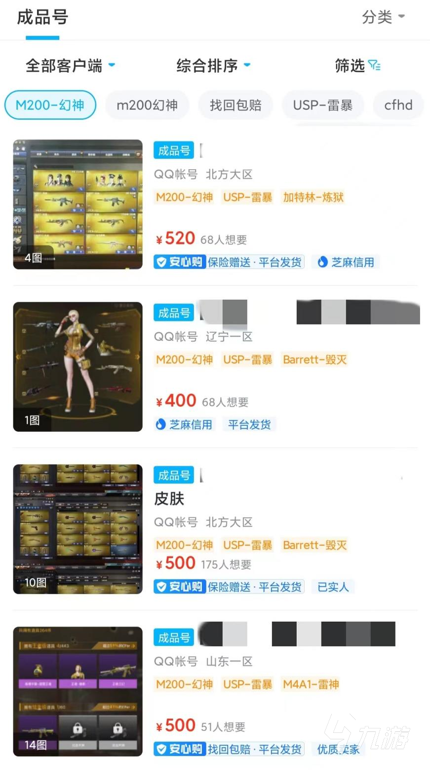 接下來小編告訴大家如何快速的找到自己想要的有M200幻神槍的賬號,首先玩家要要在首頁找到穿越火線這款游戲,一般像穿越火線這種比較熱門的游戲交易貓首頁都有推薦,并且設(shè)立的都用專區(qū),玩家進入穿越火線游戲?qū)^(qū)點擊成品號,在篩選欄V槍選項中就能看到M200幻神了,選擇好點確定,這樣玩家在賬號商品中看到的就都是有M200幻神的賬號了,接下來就可以盡情挑選了,省時省力。