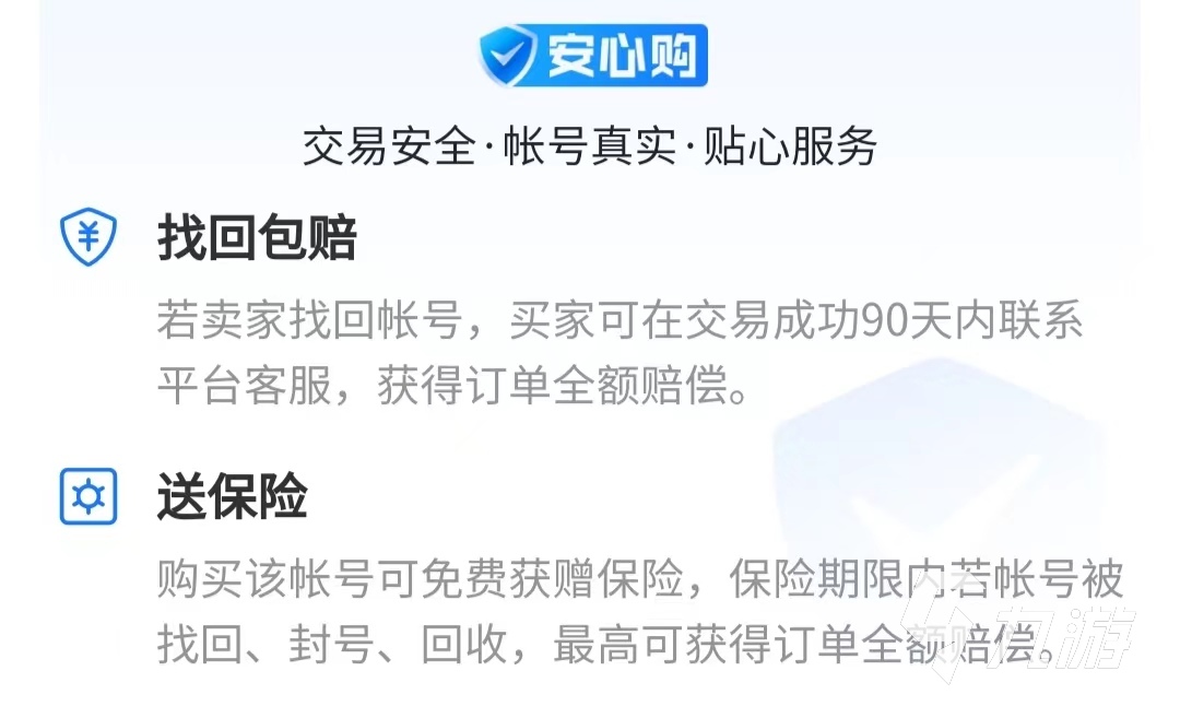 2、交易貓上買號(hào)不怕找回。買游戲賬號(hào)的玩家們都會(huì)有一個(gè)顧慮,這個(gè)賬號(hào)畢竟是別人的,就算買過來了完成賬號(hào)綁定了,但是賣家還是可以找回賬號(hào)的,那游戲損失怎么辦?在交易貓上不用擔(dān)心,如果買號(hào)的時(shí)候選擇了“找回包賠”服務(wù)的賣家,那么在90天內(nèi)如果賬號(hào)被找回了可以找平臺(tái)索賠。