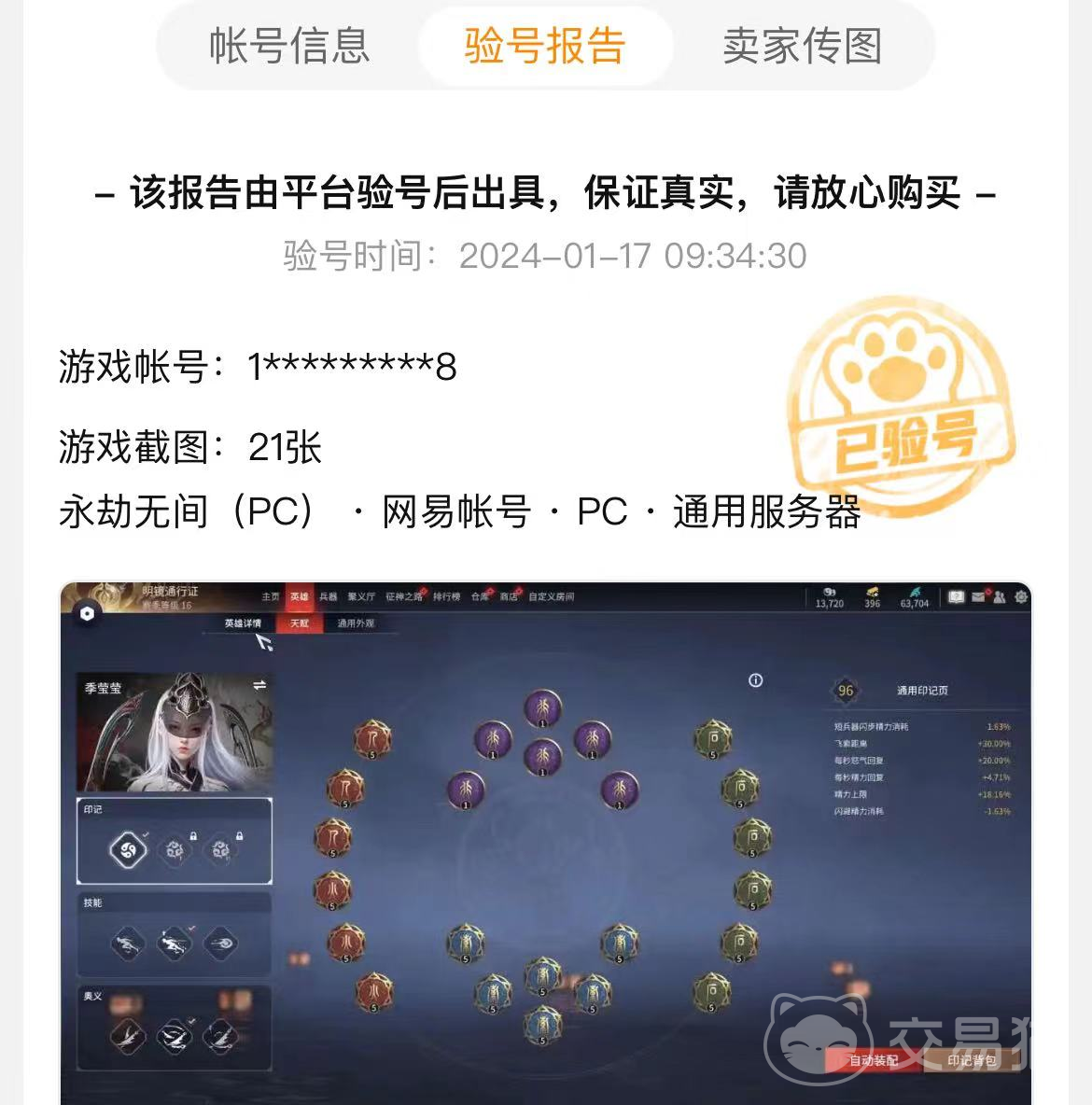 平臺向大家保證出售的賬號都是真實可靠的,在買家下單之前,平臺就已經(jīng)安排好人手來對賬號進行驗證,只有驗證通過的賬號才能獲得驗號報告。每份報告都清楚寫明驗號的時間、賬號歸屬的服務器,還帶有一些截圖來佐證資料的真實性。