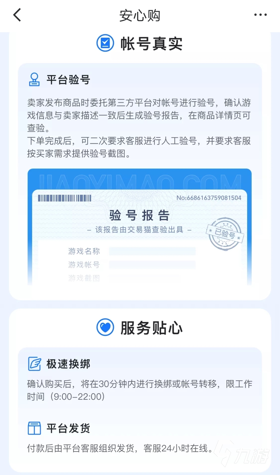 平臺(tái)會(huì)要求每位賣家都經(jīng)過(guò)真人驗(yàn)證,但顯然這么做并不能勸退所有騙子商家,而且交易貓只是提供一個(gè)交易平臺(tái),只能從流程方面嚴(yán)謹(jǐn)、嚴(yán)格,所以平臺(tái)推出安心購(gòu)、交易險(xiǎn),這也是考查賣家是否真心實(shí)意賣賬號(hào)的一個(gè)參考方面,但凡有安心購(gòu)標(biāo)識(shí)的商品,商家的芝麻信用都在優(yōu)秀以上。