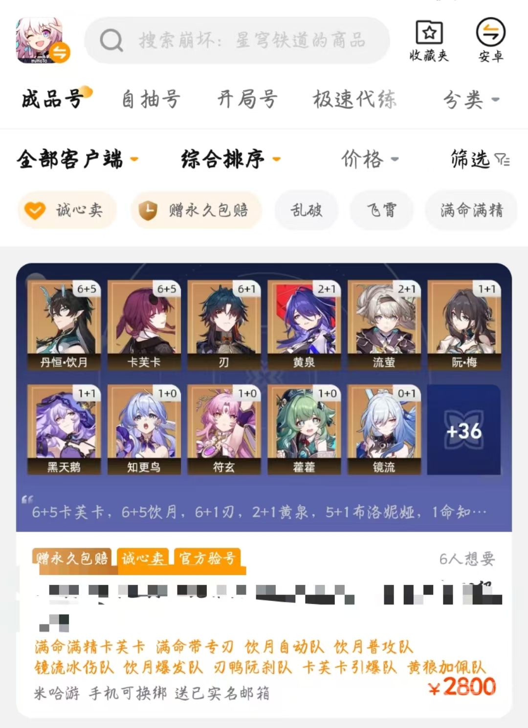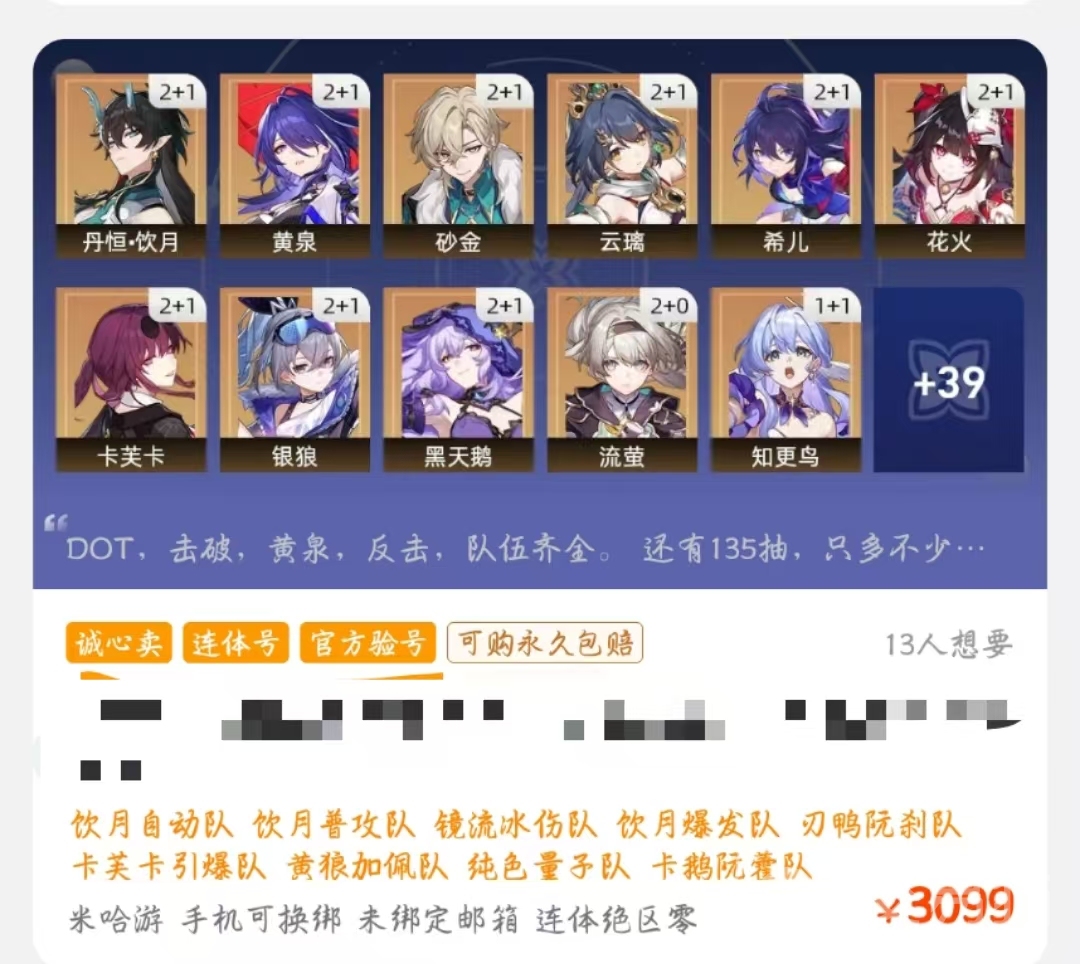 此外,如果小伙伴們想買游戲賬號并且運氣好的話,還可能會買到連體號,比如下面給大家分享的這一個游戲賬號,就包含了絕區(qū)零,如果大家喜歡這個游戲的話,就算是賺了。同理,米哈游旗下的其他游戲也都是可能買到連體號的,都會直接給大家標(biāo)注出來。