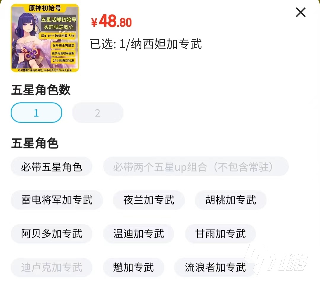 1、交易貓上關于原神開局號的好處多。原神的賬號選擇上很多,有初始號或者是自抽號。初始號就是萌新號,但是如果選擇在交易貓上買的話,可以帶5星角色,而且角色是可以自己選的,是不是很贊,比直接注冊賬號開局福利好很多了。當然自抽號在交易貓上也很熱門,大多賬號可以抽好多次,這么多次數(shù)總能抽到一個五星角色吧。所以在交易貓上買開局號是不是很不錯。