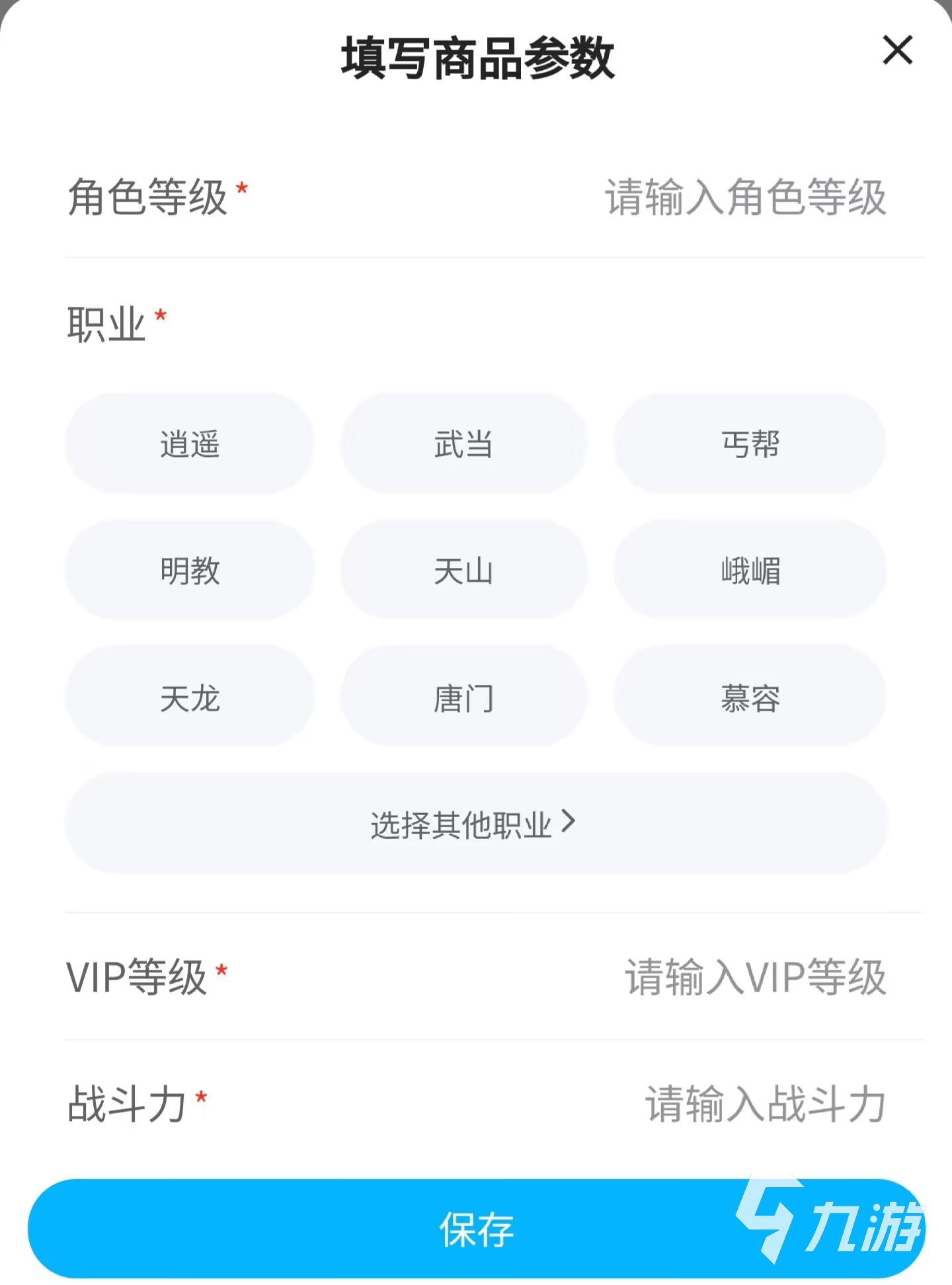 第二步則是來到我要賣專區(qū)選擇該手游,填寫自己賬號的基礎(chǔ)信息就是重要的參數(shù)了,游戲等級、職業(yè)、VIP等級這些都對個(gè)人的賬號價(jià)值和流量曝光度有一定的影響,總之填寫的越詳細(xì)約越好,但要在標(biāo)題上突出重點(diǎn),重點(diǎn)的熱搜詞可以來到游戲?qū)^(qū)內(nèi)查看,比如說明教、峨眉這兩個(gè)門派最近比較火。