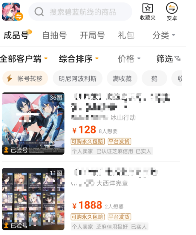 一些運營了多年的游戲如果再去玩的話,直接買一個成品號是更好的選擇,直接搜索你想要的艦船、皮膚、裝備??紤]到碧藍航線這個游戲本身難度也不大,是個廚力向的游戲,直接買個滿收藏的大佬棄坑號,直接化身“老玩家”不是問題。