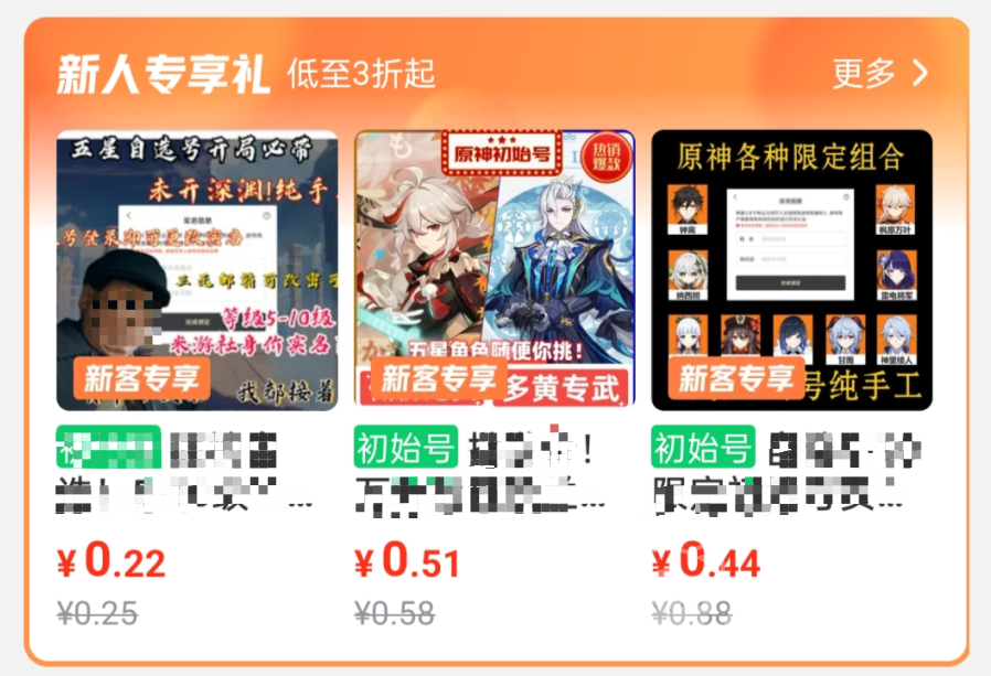 以熱門的二次元游戲原神為例,一直有很多新人入坑,交易貓為原神設立了專區(qū),可以以很低的價格購買到一些開局號。新人的話還有專享禮,最低3折起。