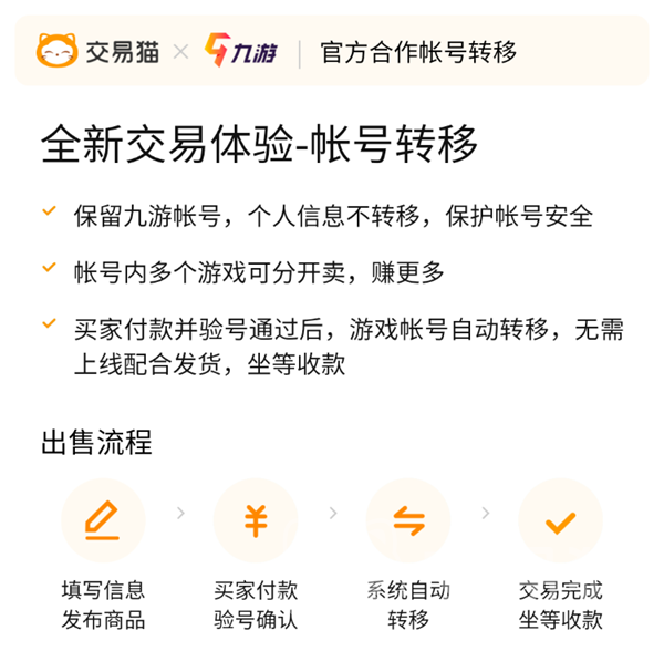 接下來要介紹的這個功能可不得了,交易貓通過與部分游戲運(yùn)營商展開合作,已經(jīng)能做到賣數(shù)據(jù)不賣號、賣角色不賣號了,那就是通過極具特色的轉(zhuǎn)移服務(wù)。比如說一款游戲,我們在很多大區(qū)都游玩了,那么通過使用賬號轉(zhuǎn)移功能就不需要把整個號都賣出去,只需要標(biāo)注好出售的大區(qū),就會自動把對應(yīng)的游戲數(shù)據(jù)通過系統(tǒng)遷移過去,我們自己號中的其他大區(qū)還是可以正常游玩。