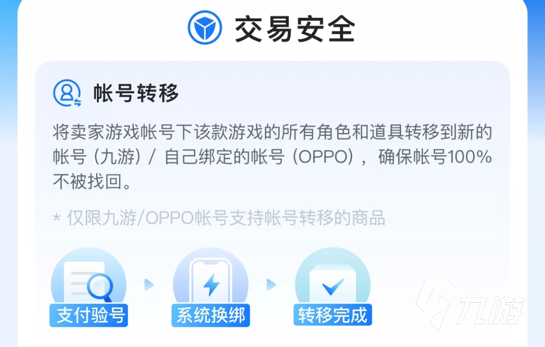 賬號(hào)轉(zhuǎn)移在交易貓平臺(tái)當(dāng)中是一種非常具有特色的服務(wù)。通過賬號(hào)轉(zhuǎn)移,賣家所出售的賬號(hào)中的角色和道具會(huì)被轉(zhuǎn)移到新的賬號(hào)中來(lái)。賣家所出售的賬號(hào)通常會(huì)綁定手機(jī)和郵箱,而新的賬號(hào)沒有任何的綁定,安全性非常高。目前賬號(hào)轉(zhuǎn)移的功能只對(duì)九游和OPPO這兩個(gè)渠道服務(wù)器進(jìn)行開放,想要購(gòu)買這兩個(gè)服務(wù)器賬號(hào)的用戶們,可以去體驗(yàn)這個(gè)功能。