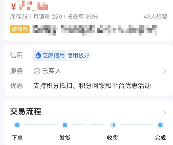 點擊想要購買的游戲幣商品之后可以進入到商品詳情中,在這里可以看到更多的信息,括賣家的信用評分、特色服務(wù)等。游戲幣和賬號的購買略有不同,省去了換綁的操作,所以僅僅有四個步驟,到賬更快哦!
