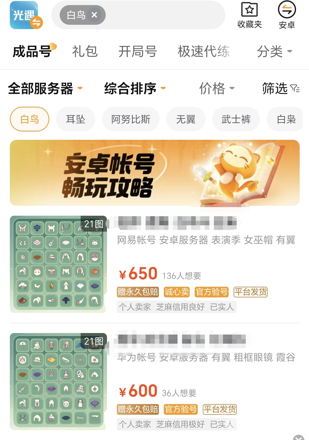若玩家想要了解帶有白鳥角色的賬號價格,可以直接在專區(qū)頂部的搜索框中輸入“白鳥”進行查詢,系統(tǒng)會自動篩選出所有包含該角色的賬號。這樣高效便捷的操作方式,能夠幫助玩家迅速掌握該類賬號的市場行情,從中選出價格最實惠的選項,也就能輕松找到光遇白鳥最便宜的賬號了。