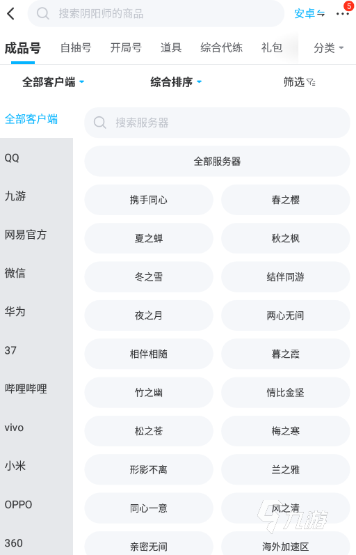 交易貓上關(guān)于陰陽(yáng)師的商品是非常多的,而且我們?cè)诤Y選詞條的時(shí)候可以發(fā)現(xiàn),上面會(huì)有各種客戶端以及服務(wù)器可以選擇,除了網(wǎng)易官方以外,其他的就是我們所說(shuō)的渠道服了,所以同理,我們?cè)谫u(mài)號(hào)的時(shí)候也可以這樣選擇。