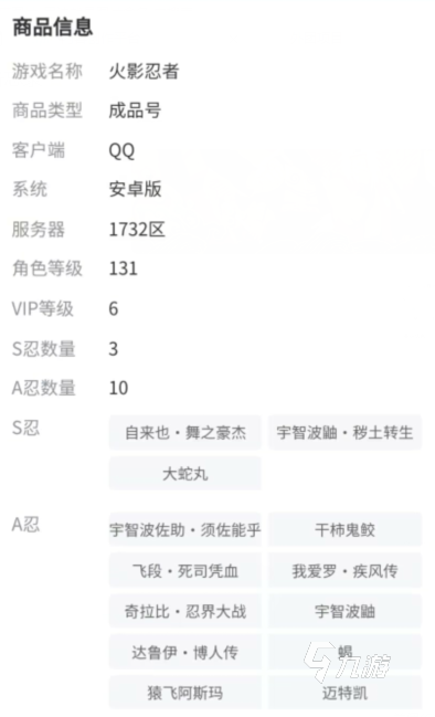 平臺對于每一款游戲都進行了分區(qū)處理,進入游戲分區(qū)搜索關鍵字如自抽,就可以看到滿足要求的游戲賬號了,點擊進入賬號詳情頁面,還可以查看賬號的詳細信息,在信息頁面會寫明如多少抽、有什么忍者、客戶端、服務器等,這些信息可以讓用戶一眼收進賬號的情況。