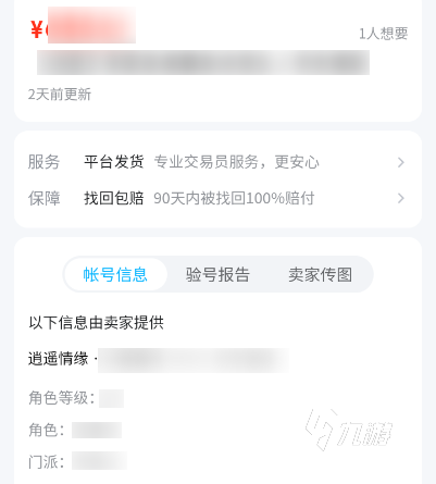 另外,在商品的詳情頁中我們還可以看到更多的內(nèi)容。比如賬號的一些基本信息,包括角色的等級、角色的職業(yè)種類、其加入的門派,擁有的高等級武器裝備、培養(yǎng)材料或者是實(shí)用的道具等。大家在挑選賬號的時候也要認(rèn)準(zhǔn)一些帶有服務(wù)標(biāo)簽的商品,這些特色的服務(wù)就是交易貓為我們提供的一些保障和福利,比如平臺發(fā)貨或者是找回包賠等。