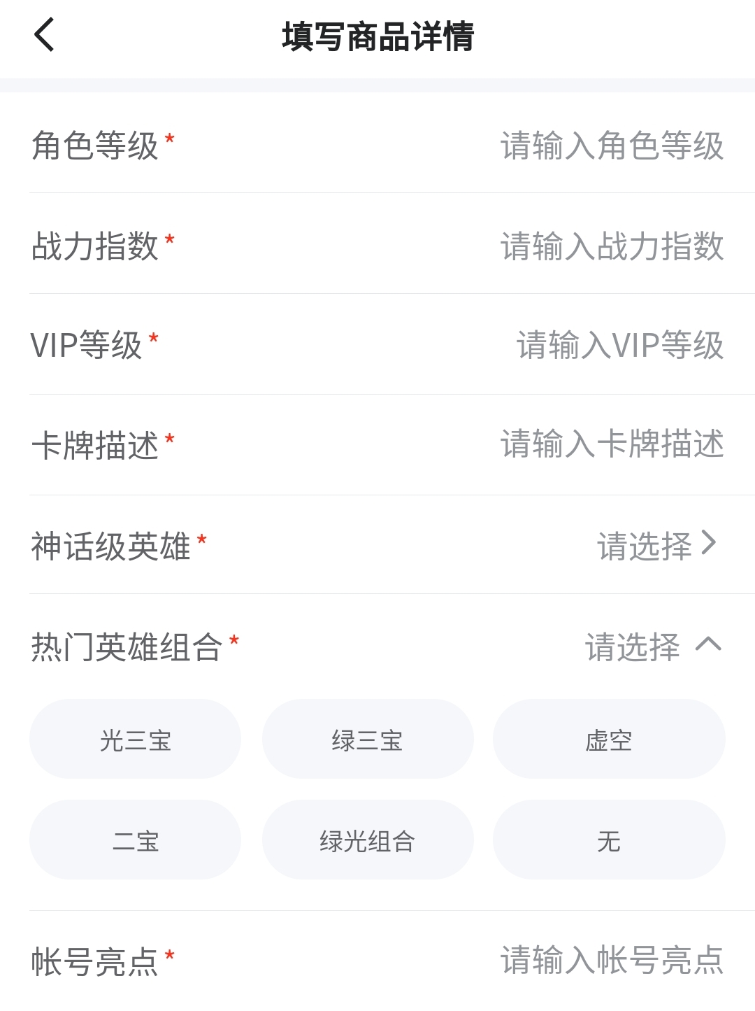 很多人不知道如何突出賬號亮點,洋洋灑灑寫一堆內(nèi)容,買家抓不住重點,很可能就劃走看其他人的商品了。交易貓中許多游戲,平臺已經(jīng)為你規(guī)劃好需要填寫的商品詳情,不需要你再費心思編輯介紹,并且每一條直接、明了地列在詳情頁,讓買家迅速get賬號亮點。