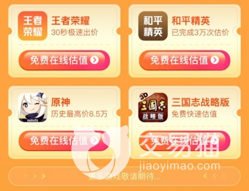 第二個(gè)是用戶參考估價(jià),這是對(duì)于不滿足上個(gè)條件的游戲所增添的新功能,試想作為消費(fèi)者的屏幕前的你可以在交易貓中搜索相關(guān)的條件來檢索出對(duì)應(yīng)的賬號(hào)商品然后與自己想賣出的條件作為一個(gè)參考。小編之前也使用過這個(gè)功能,賣出的價(jià)格超出了自己的預(yù)期,總體來講,真心推薦!想試試的小伙伴不要錯(cuò)過?;蛘哒f,如果你還在猶豫要不要賣號(hào)的時(shí)候,你可以先看看這個(gè)平臺(tái)的估值是否符合自己的預(yù)期,多嘗試一下未必不可。 當(dāng)然了,現(xiàn)在交易貓平臺(tái)中有很多入駐的主播,有很多的主播也帶有人工估值或者是代賣的服務(wù),聯(lián)系他們一般是可以獲得更為準(zhǔn)確的價(jià)值參考。