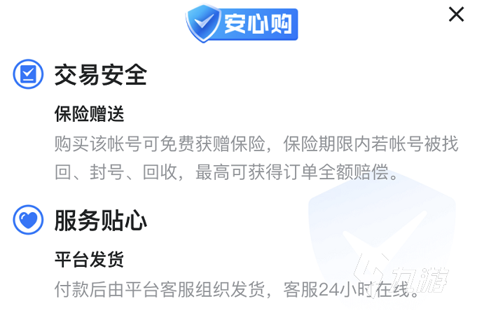 挑選到合適的賬號之后就可以進行購買了,平臺會對玩家提供非常嚴格的程序把控,交易不能脫離平臺進行,所有交易的用戶必須進行實名認證,而且交易流程也有非常嚴格的要求,買家需要先支付貨款,賣家才能提供賬號。還擁有安心購功能,多重安全保障,讓所有玩家都可以用著放心。