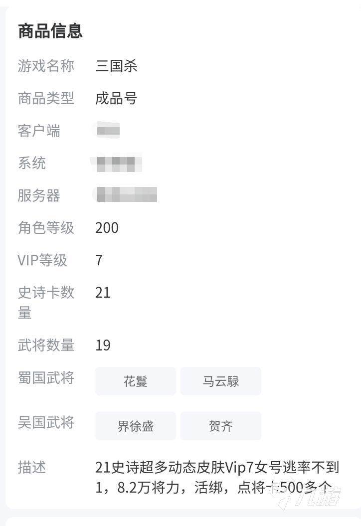 相信很多賣家的想法都是比較一致的,對于已經(jīng)上架出售的賬號,每個人都想盡快售出,平臺正是看中了大家這一點(diǎn),于是給了商家們展示自己的機(jī)會,在商品發(fā)布方面,大多數(shù)人選擇多圖展示,一個商品攜帶多張圖片,這樣玩家們最關(guān)注的內(nèi)容可以說是一目了然。其次在賬號的介紹中,也可以看到一些有關(guān)信息,比如三國殺這款游戲,玩家、買家們最看重的就是武將數(shù)量,畢竟有些限定武將的價值確實很高,那么在描述區(qū)就可以看到和武將有關(guān)的描述。