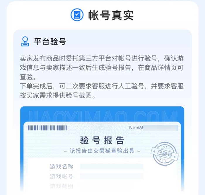 其次,小伙伴們就是關(guān)心游戲賬號(hào)本身質(zhì)量的問(wèn)題了。以往很多小伙伴們?cè)谫I賬號(hào)付完款之后,上號(hào)之后才發(fā)現(xiàn)游戲賬號(hào)內(nèi)的裝備、等級(jí)、武器等一系列信息都是假的,就這樣很多買號(hào)的小伙伴就又當(dāng)了純純的大冤種。對(duì)于這種情況交易貓更是提出了平臺(tái)驗(yàn)號(hào)這項(xiàng)服務(wù),虛假的信息賬號(hào),平臺(tái)是不會(huì)讓他上架且出售的,所以小伙伴們有需要買號(hào)的凡是在平臺(tái)上看到的賬號(hào)都一定沒(méi)有問(wèn)題,都是平臺(tái)經(jīng)過(guò)層層驗(yàn)證過(guò)的。就是可見(jiàn)即可得。