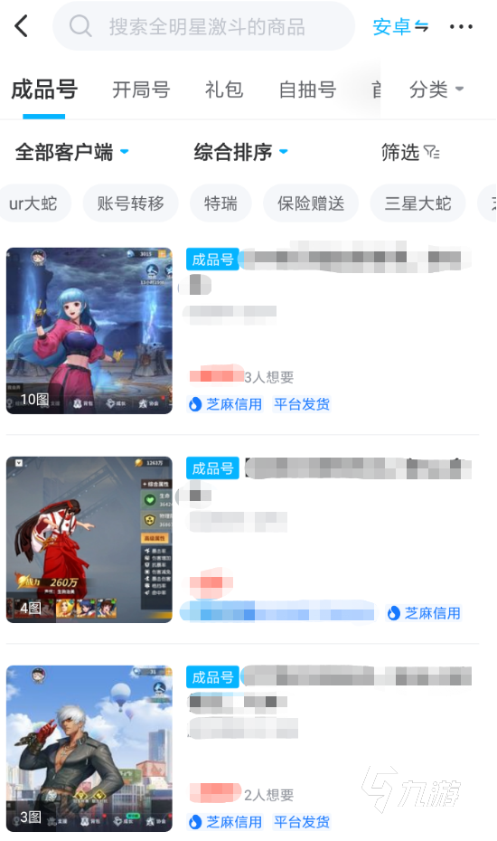 2、大量的成品號商品,會在全明星激斗的專區(qū)當(dāng)中等待著玩家們前去瀏覽。完善的商品信息會幫助各位更快速的去進(jìn)行了解,每一個游戲的截圖也非常重要,玩家需要認(rèn)真觀察來判斷是否值得大家進(jìn)行購買。當(dāng)然,不同成品號因為賬號內(nèi)容的差異,在價格方面也會存在較大的不同。