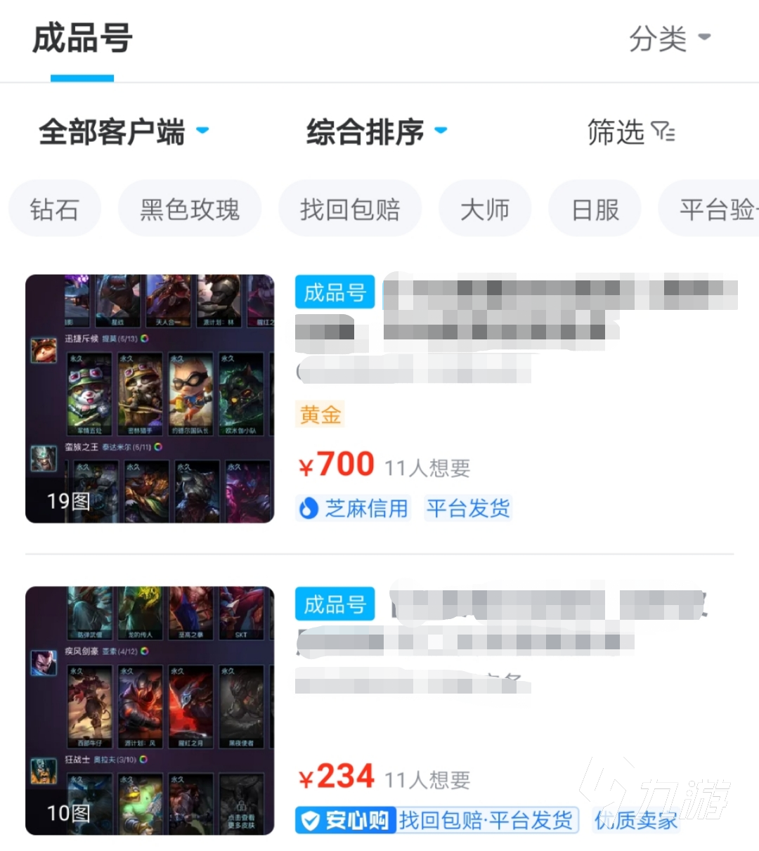 想要玩好lol,賬號的質量一定要跟得上,平臺上有非常多的lol賬號,這些賬號涵蓋所有的區(qū)服,無論買家需要的是滿級賬號還是全英雄的賬號都可以在里面找到,還有一些質量很高的半成品號,絕對滿足不同買家的需求。大家在挑選賬號的時候可以通過勾選區(qū)服、設置條件等方式來精準搜索到自己需要的賬號,找號更方便。