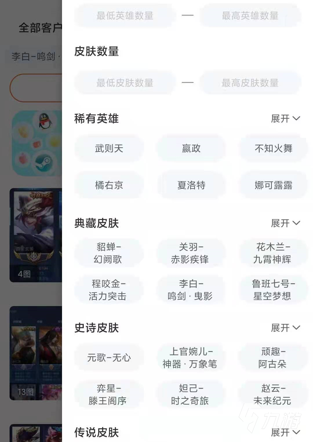 王者老玩家都知道,王者榮耀發(fā)布至今的皮膚跟下餃子一樣,加上交易貓里王者賬號比比皆是。想知道成品號有沒有包羅自己所求的皮膚,個個都點開非常耽擱時間。用戶利用發(fā)布時間的早晚等排序,可自由選擇典藏、史詩或傳說皮膚及皮膚數(shù)量,還能實現(xiàn)對范圍內(nèi)賬號的篩選。助你加快買號的步伐。