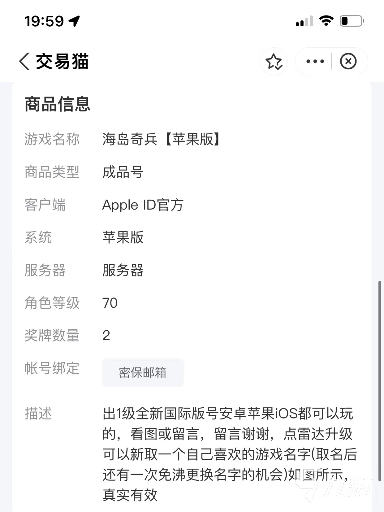 以上就是小編給大家?guī)淼暮u奇兵賬號在哪買這個(gè)問題的解答。買賣賬號最重要的就是安全,在交易貓中不僅能找到多種類型的賬號,還有官方客服為用戶們保駕護(hù)航,快去搜索交易貓?jiān)囋嚢桑?/p>
