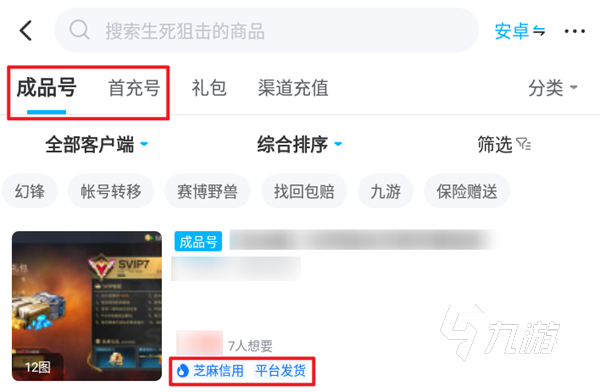 大家在交易貓中輸入生死狙擊游戲名稱,是可以直接進(jìn)入到專區(qū)中的,目前在游戲商品方面,分為了首充號、成品號以及禮包等類型。成品號應(yīng)該不用介紹,就是已經(jīng)游玩了一段時間,里邊一般帶有一些角色皮膚等道具,或者是帶有比較好的戰(zhàn)績、比較高的段位和等級。那么首充號要稍微介紹一下,首充什么意思大家都知道,所謂的首充號其實就是默認(rèn)已經(jīng)解鎖了首充的獎勵。但是這個獎勵不是固定了,每一期的內(nèi)容都有著些許不同,所以如果大家是瞄準(zhǔn)了某一個限定的獎勵,也要注意這個號獲取獎勵的時間哦。