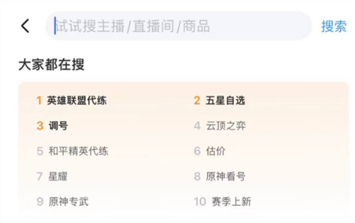進(jìn)入平臺(tái)的快捷搜索界面,可以看到玩家們最感興趣、搜索率最多的游戲有哪些,同時(shí)設(shè)置了搜索欄來(lái)方便用戶們查找,不論是商品還是主播以及直播間,都可以快速搜索進(jìn)入,因?yàn)樗锩娣植嫉墓δ鼙容^多,所以大家在進(jìn)入后可選的服務(wù)也多,直播功能的推出也是非常的受捧,畢竟這個(gè)方式能夠更方便大家交流溝通。