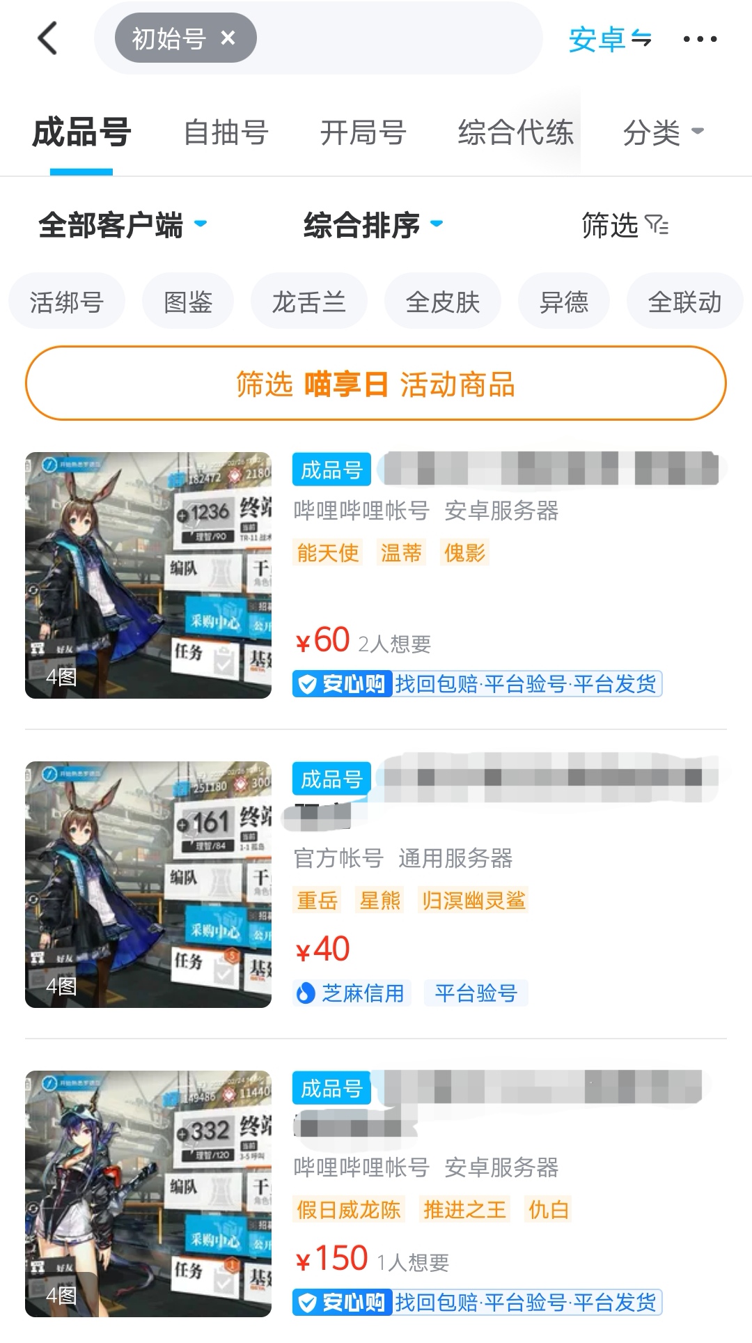 其實對于初始號的購買還是比較容易的,因為在初始游戲賬號當(dāng)中的資源和道具內(nèi)容都比較少,沒有什么對比性,大家可以在交易貓軟件當(dāng)中找到明日方舟游戲的專區(qū),再去進(jìn)行搜索初始號后就會得到非常多的商品了,想購買其他的游戲賬號類型操作也是如此。