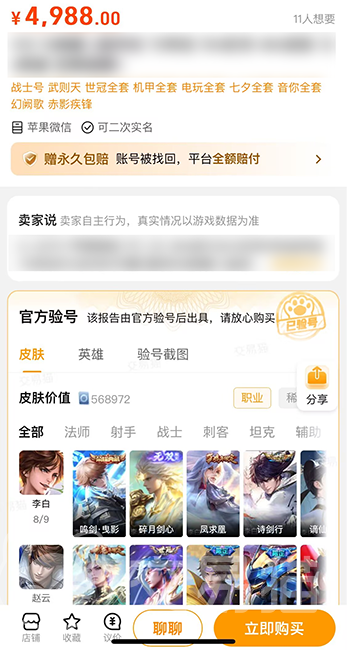 第三,買號贈送永久包賠,實現售后無憂。平臺許多成品號支持這一保障,規(guī)避買家?guī)ぬ柋徽一?、封禁、被毀、角色丟失等風險。買家?guī)ぬ柋粍h除,通過圖片等憑證,向交易貓客服索賠。