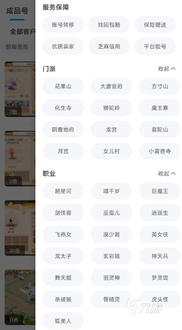 2、篩選種類多。夢幻西游專區(qū)中可對某個神獸、職業(yè)以及門派進(jìn)行篩選,共十二個門派和十九個職業(yè)的賬號都有,也能對人物賬號評分設(shè)定一個范圍,通過這些詳細(xì)的數(shù)據(jù)來定位賬號,如果自己的預(yù)算有限,也可以將排序調(diào)整成為價格從低到高,這樣就會優(yōu)先展示便宜的賬號。