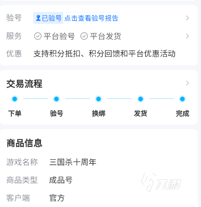 多重保障,交易無憂:在交易貓進(jìn)行賬號交易的時候,它除了能夠為大家提供平臺驗號以及平臺發(fā)貨以外,還有著不同的優(yōu)惠,并且驗號的報告大家也可以去實時的查看,包括賬號之中的具體情況也有截圖呈現(xiàn),整個交易也分為五步驟,交易的流程比較的簡單,同時安全性也是比較高的。