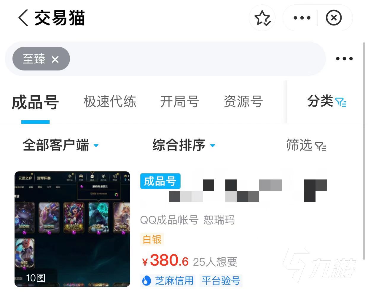 第二種方法是在英雄聯(lián)盟專區(qū)中搜索和自己賬號差不多的商品,目前交易貓中掛號和買號的玩家都特別多,所以大家都是很輕易就能找到類似的賬號,舉個例子來說,先判準(zhǔn)自己賬號主要的值錢點(diǎn),例如有“至臻皮膚”,就搜索其他也有至臻皮膚的號,看看對方的價格,再大概定出自己的價格。