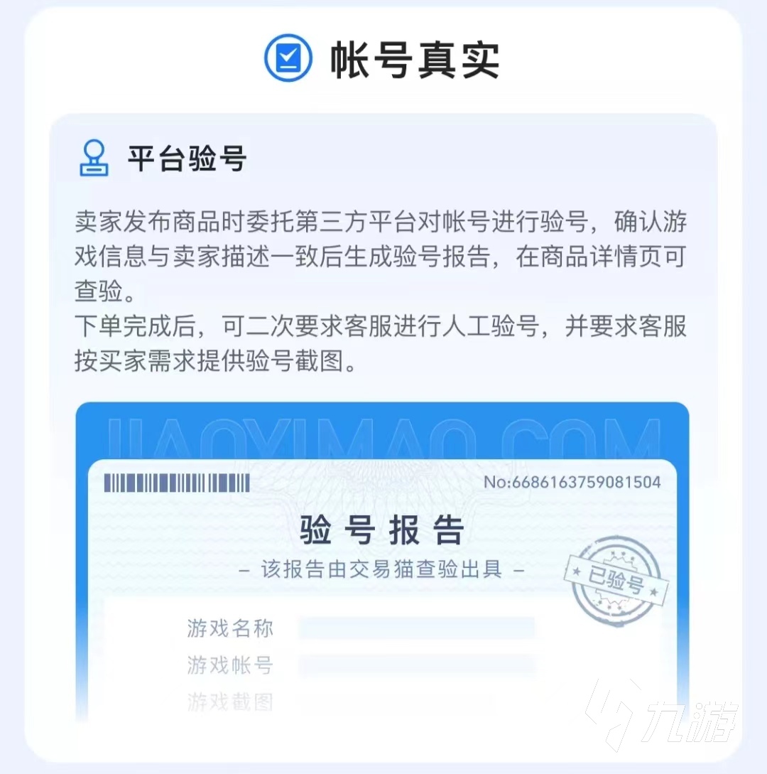 2、服務(wù)貼心又周到。想要賣(mài)賬號(hào)的玩家們有一個(gè)擔(dān)憂,就是賬號(hào)交易的時(shí)候怎么來(lái)證明自己賬號(hào)內(nèi)武器裝備的真實(shí)性,如果直接給買(mǎi)家,自己的賬號(hào)會(huì)不會(huì)有風(fēng)險(xiǎn),在交易貓上就不會(huì)有這個(gè)擔(dān)憂。交易貓上提供“驗(yàn)號(hào)”服務(wù),也就是說(shuō)賣(mài)家只要將自己賬號(hào)信息交給平臺(tái),平臺(tái)會(huì)驗(yàn)號(hào),還會(huì)給賣(mài)家一個(gè)驗(yàn)號(hào)報(bào)告。這樣就幫助了賣(mài)家證明自己賬號(hào)真實(shí)性也節(jié)省了交易中來(lái)回拉扯的驗(yàn)號(hào)環(huán)節(jié)。