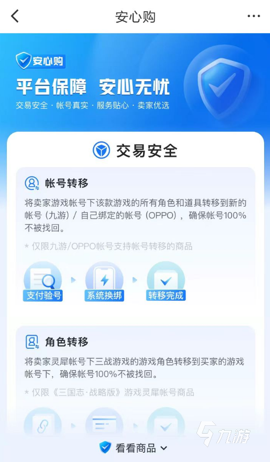 3、當(dāng)然,基礎(chǔ)的交易保護(hù)針對(duì)部分玩家來(lái)說(shuō)并不會(huì)有太大的吸引力,所以平臺(tái)也早就推出了包含安心購(gòu)服務(wù)的商品。目前只針對(duì)部分商品開(kāi)放的此服務(wù),將讓玩家們可以直接享受平臺(tái)的保障,整個(gè)賬號(hào)交易的安全問(wèn)題就再也無(wú)需擔(dān)心。