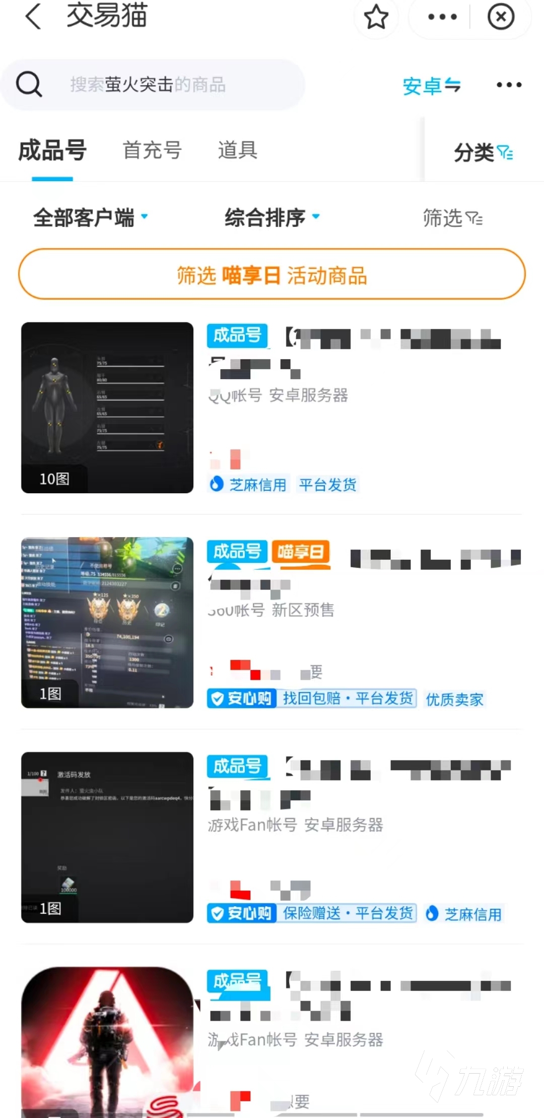 以上就是小編收集到螢火突擊賬號(hào)交易平臺(tái)哪個(gè)好的全部信息,在交易貓中,幾乎每一筆交易都是令人滿(mǎn)意的,尤其是那些有安心購(gòu)和找回包賠標(biāo)志的賬號(hào),可以讓你放心大膽的購(gòu)買(mǎi)賬號(hào),即使被賣(mài)家修改密碼,你也不會(huì)有任何損失。