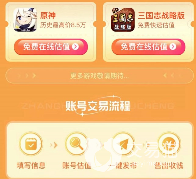 之所以選擇交易貓這個游戲賬號交易平臺,最主要的原因還得是這個平臺,它支持三國志戰(zhàn)略版這個游戲的免費估值服務。我們都知道,賬號交易平臺提供的估值服務,往往都是要收取費用的,盡管有不少的小伙伴迫切地想要知道自己游戲賬號的價值,可是礙于手頭資金緊張的問題也只能放棄。因此選擇交易貓這個平臺為自己的游戲賬號進行估值,還是十分不錯的。