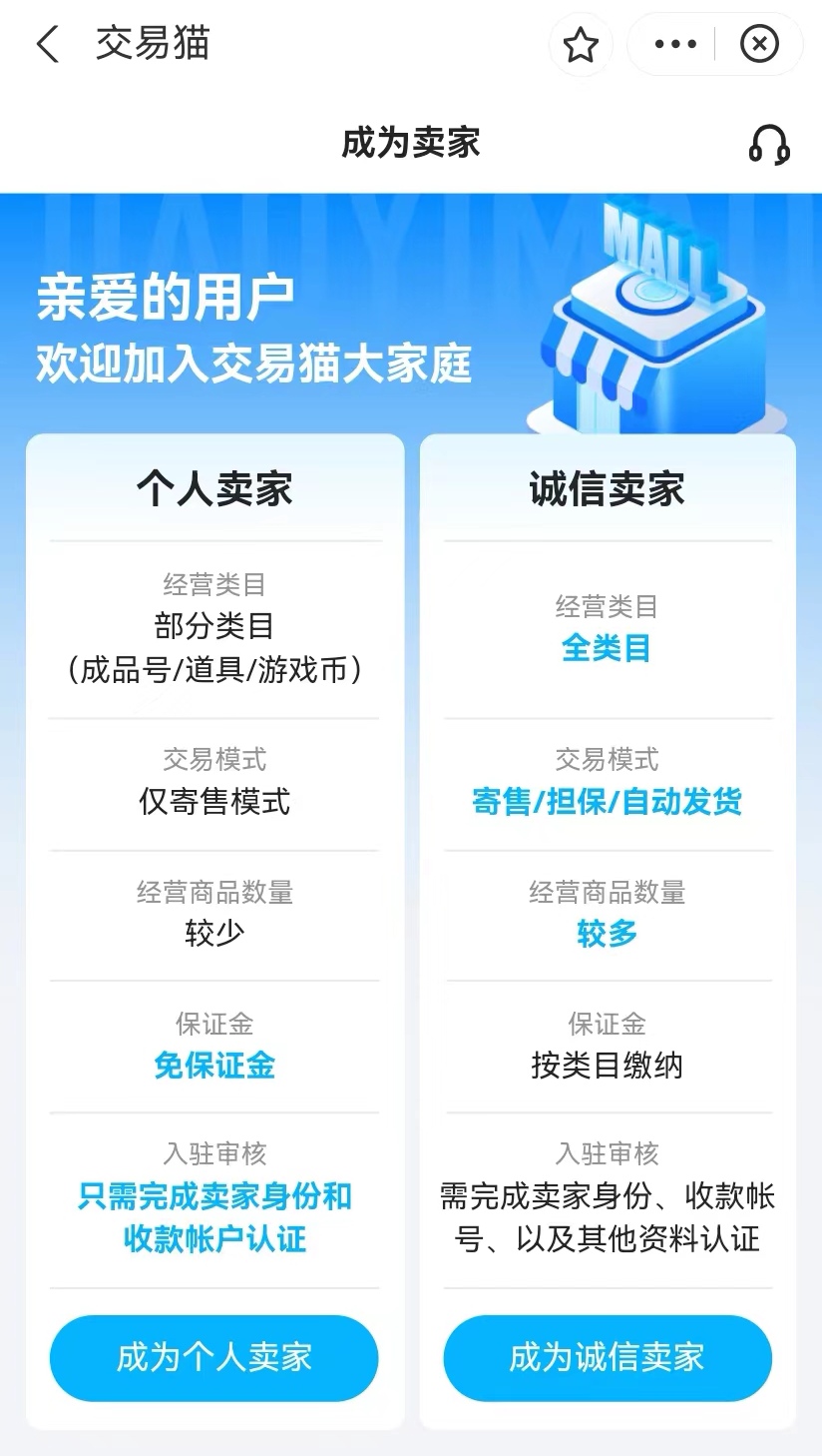 第一,有這方面需求的小伙伴們,要去點擊小編上方的按鈕去下載交易貓,在初次使用時都會進行驗證和基本信息的填寫,這樣你才能去更暢快的體驗這個平臺去出售賬號,完成注冊與驗證之后大家可以成為一名賣家,也可以通過交納一些金錢來成為誠信賣家,因為相對于而言誠信賣家更容易將自己的賬號出售。